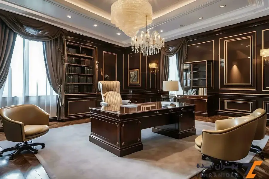 طراحی دفتر وکالت لاکچری با معماری اروپایی و سقف بلند