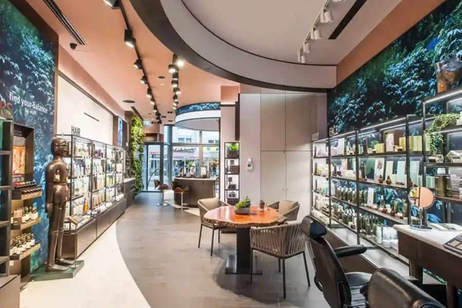 نور طبیعی و دقیق، مهمترین عامل در این فضاست. استفاده از نور سفید، آینههای بزرگ و رنگهای روشن مثل صورتی یا سفید، حس تمیزی و جذابیت ایجاد میکند. طراحی میز تست محصولات تجربه خرید را بهبود میدهد.